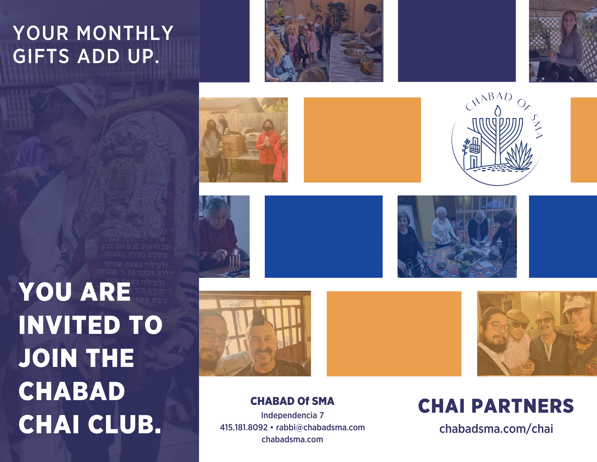 Every month your donation will join others to create a lifestream and financial stability for Chabad. You will be giving the SMA Jewish Community a place to explore, increase and express their Jewishness.
